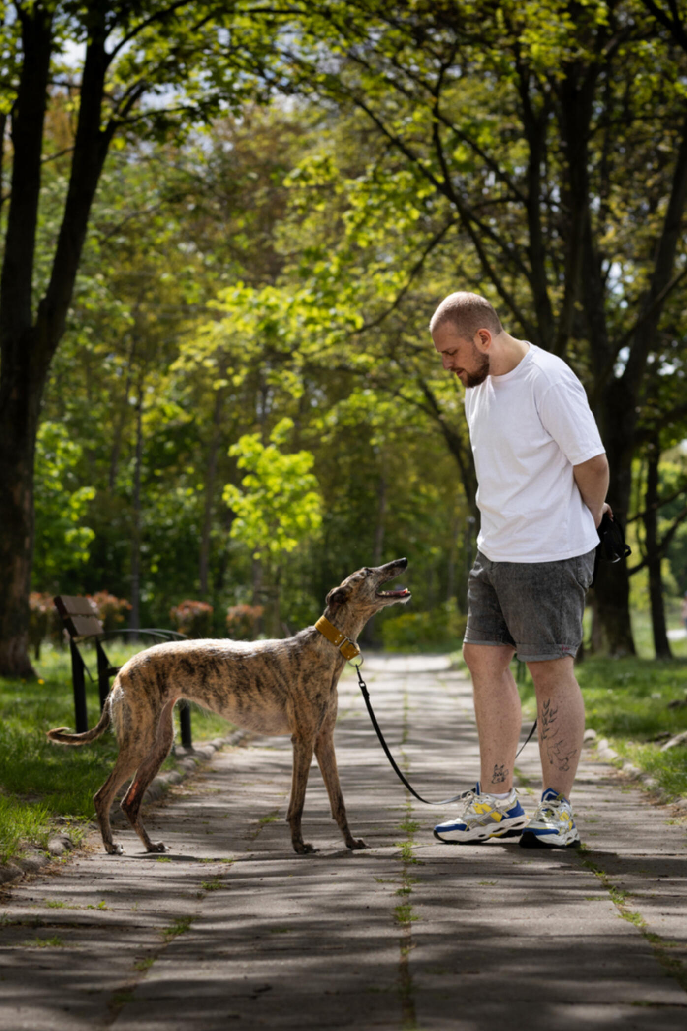 🐾 Lilly– greyhoundka o spokojnym temperamencie. Jej obecność działa kojąco, a łagodny charakter sprawia, że z łatwością budzi zaufanie.
